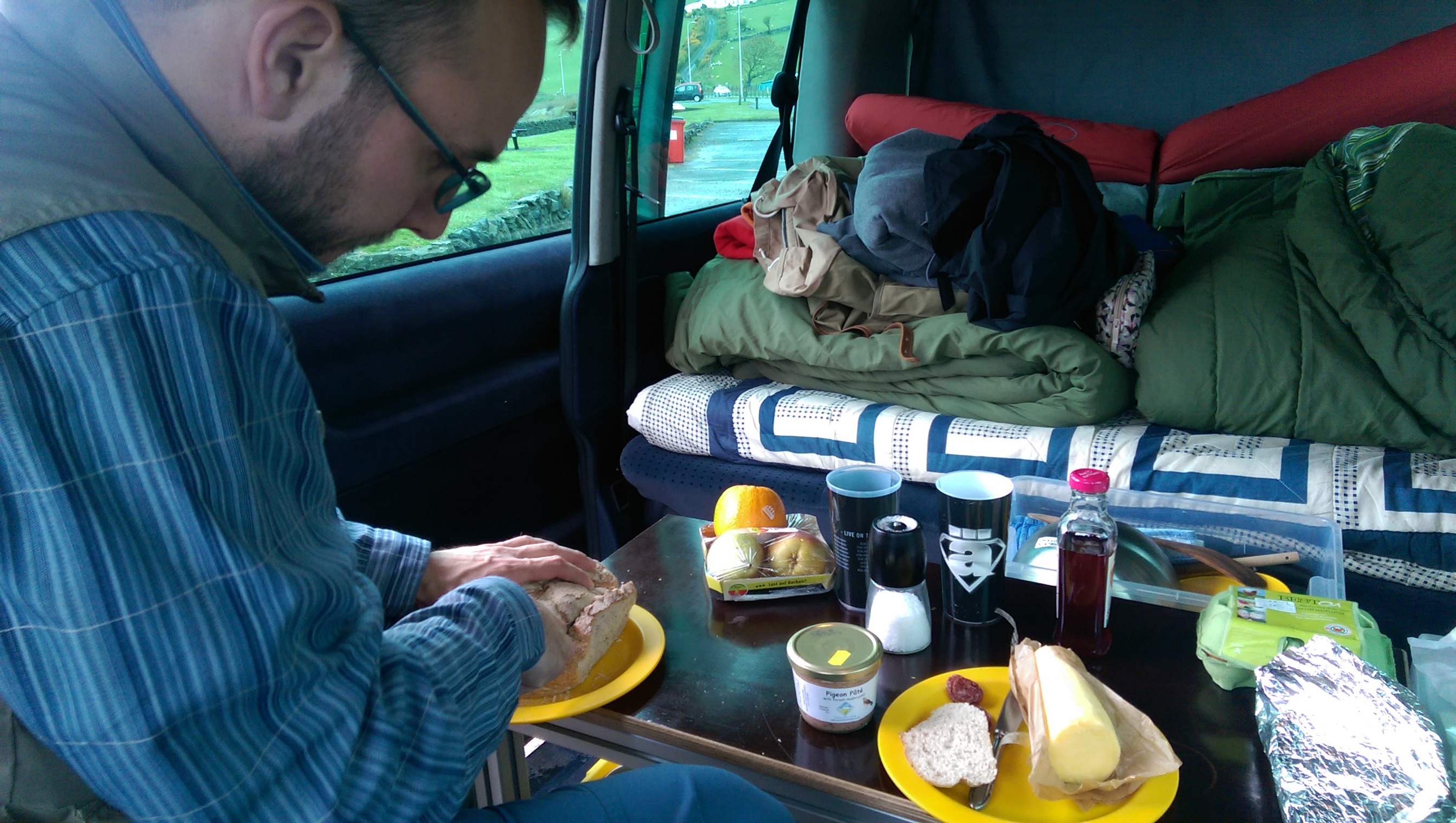 Am Abend dann noch Nervenkitzel. Wir freuen uns über den schönen Parkplatz direkt an der Fähre, die uns am nächsten Morgen nach Belfast bringen soll, machen Abendessen und einen Abendspaziergang. Als wir zurück kommen läuft ein alter Schotte ums Auto. Er klärt uns darüber auf, dass overnight sleeping hier verboten sei. Wir machen auf unschuldig und der Prinz holt seinen Hundeblick raus. Funktioniert. Der Schotte grinst und zeigt uns hinter welches Gebüsch wir fahren sollen. Wir folgen gehorsamst und machen sicherhaltshalber den Stealth-Modus an. Puh!