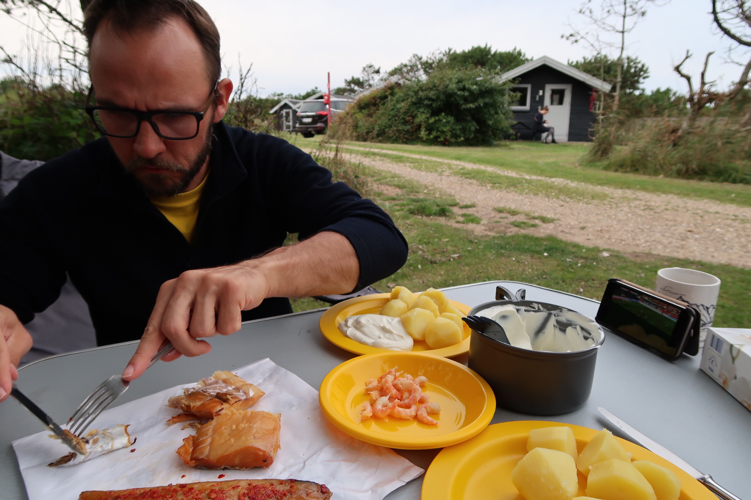 Direkt am Strand ist eine Røgerie. Wir kaufen geräucherte Makrele, Hecht und Shrimps. Zum Abendbrot gibt es diese dann wieder mit Kartoffeln und Quark auf dem sehr schönen Campingplatz von Klitmøller. Ach, ist das ein schöner ruhiger Tag. Vielleicht ist das mit dem Wellenreiten ja doch nicht so übel.