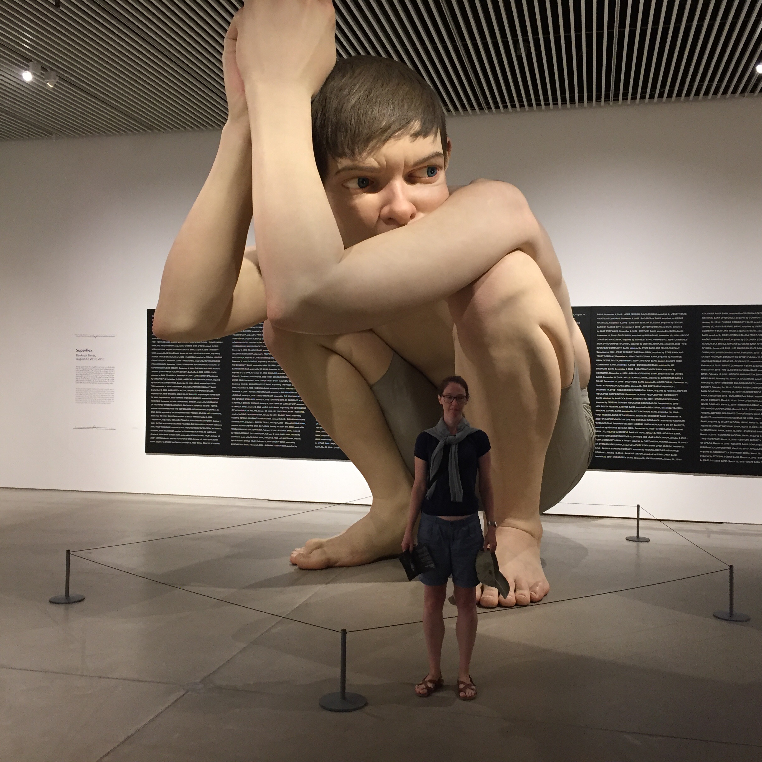 Die nächste Ausstellung mit Bildern und Installationen gefällt uns nicht so sehr, zumindest können wir mit dem zerkratzten Lamborghini und den zerfetzten Schaufensterpuppe nicht viel anfangen. Wir gehen daher schnell weiter zum Rainbow Panorama auf das Dach. Der kreisrunden Gang, bei dem man das ganze Farbspektrum mit Blick auf die Stadt ablaufen kann, ist faszinierend und toll.