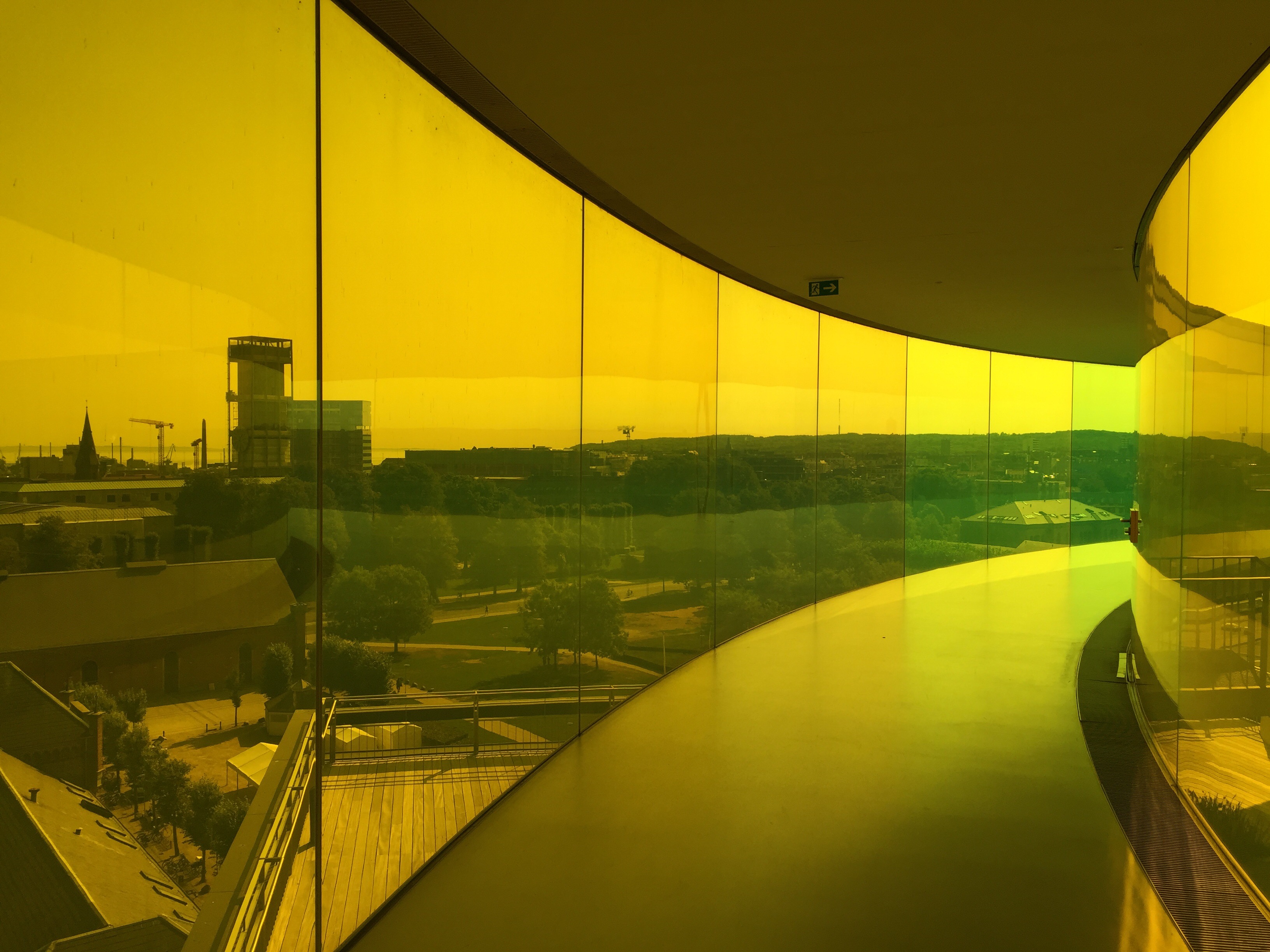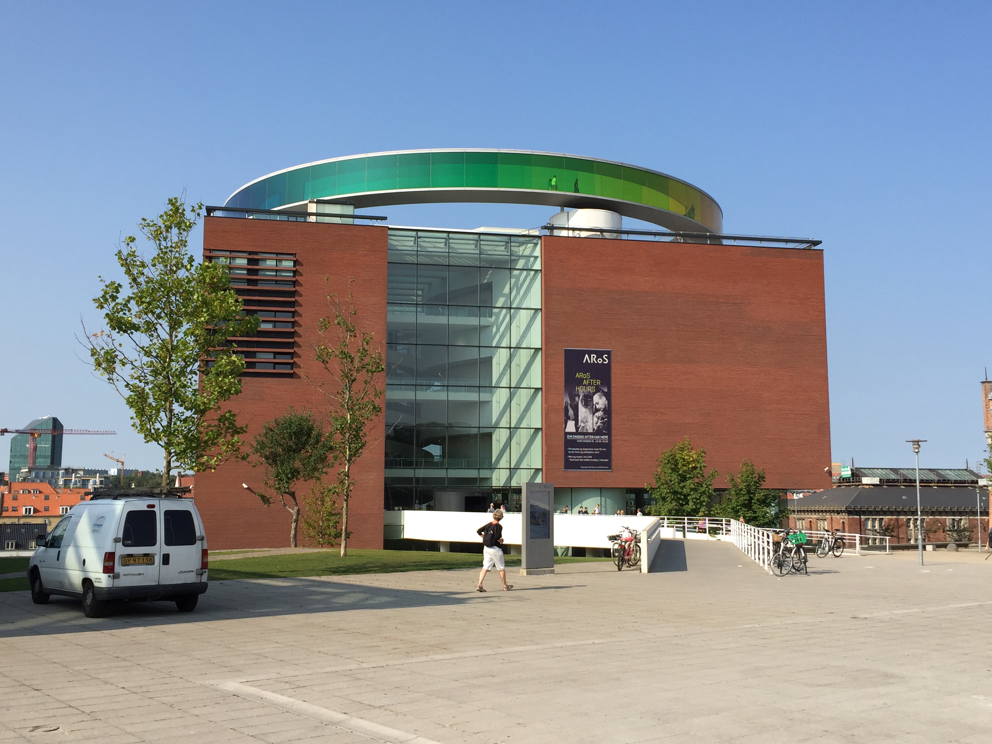 Der Tag heute gehört Aarhus, der zweitgrößten Stadt Dänemarks. Damit müde Füße, knurrende Mägen oder kurze dänische Öffnungszeiten uns nicht wieder von Kunst und Kultur abhalten, gehen wir direkt bei Ankunft ins ARoS, das Museum für moderne Kunst. Das ARoS is ein riesiger Bau mit einem regenbogenfarbenem rundem Aufbau auf dem Dach, der von weitem sichtbar ist. Ganz schön cool. Das sogenannte Rainbow Panorama ist übrigens von Olafur Eliasson, lernen wir später.