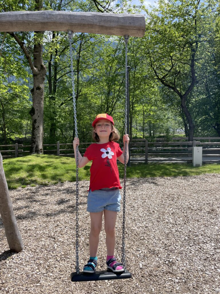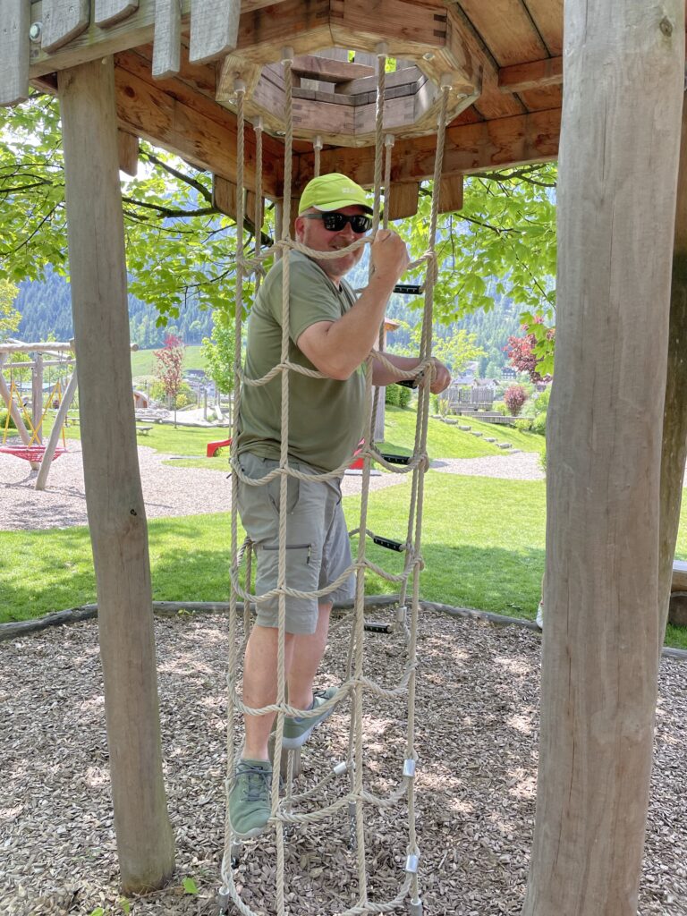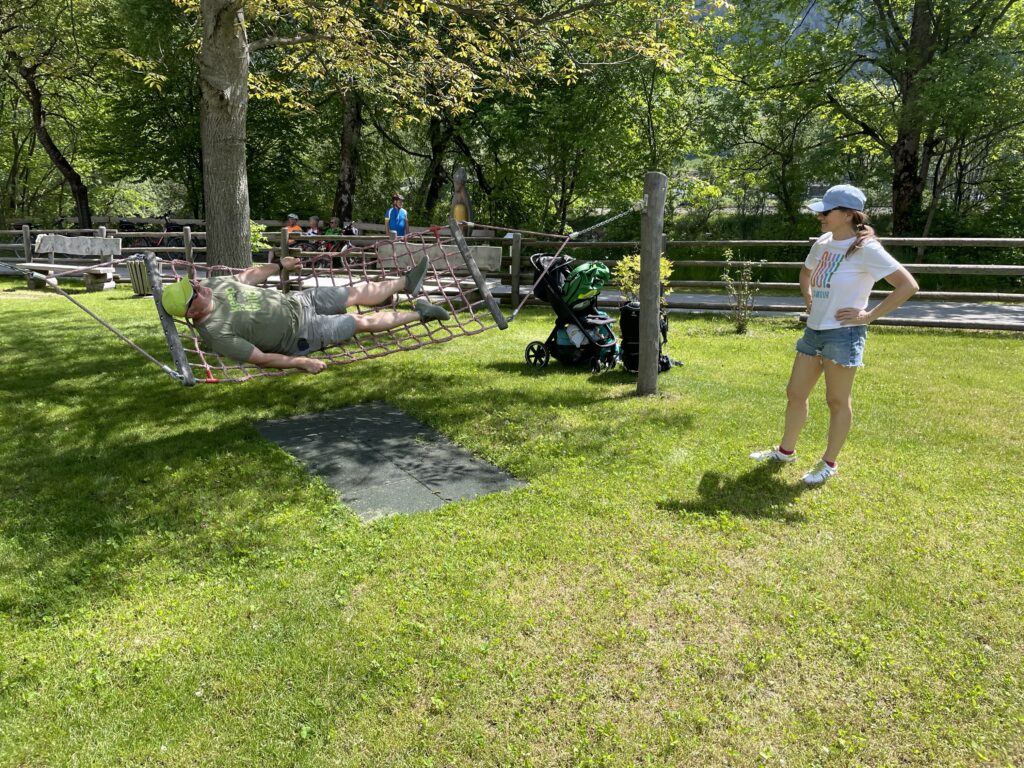 Während der Prinz an der Felswand hing, waren Jette, Ruth, Matze und ich auf dem schönsten Spielplatz, den ich je gesehen habe – dem Auenland. Wir sind in Flößen um die Wette gefahren, habe jede Schaukel über TÜV-Maßstäbe hinaus getestet, haben uns beim Trampolin springen unseren Ängsten gestellt, haben die schönsten und wahrscheinlich wertvollsten Steine gesammelt und irgendwo vergessen, haben uns in Netzen verheddert haben und natürlich Eis gegessen.